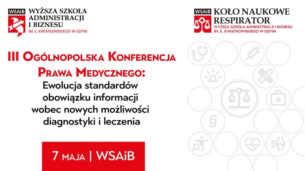 Koło Naukowe Prawa Medycznego „Respirator” zaprasza 7 maja 2025 r. na trzecią edycję Ogólnopolskiej Konferencji Prawa Medycznego. W tym roku wydarzenie odbędzie się w formule hybrydowej – zarówno stacjonarnie, w murach Wyższej Szkoły Administracji i Biznesu im. Eugeniusza Kwiatkowskiego w Gdyni, jak i zdalnie, za pośrednictwem platformy MS Teams. Uczestnictwo jest bezpłatne.
