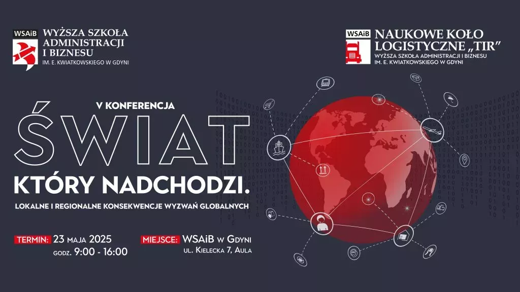 W piątek 23 maja 2025 roku w godzinach 9:00–16:00 studenci, eksperci, samorządowcy i przedstawiciele biznesu spotkają się na V edycji konferencji „Świat, który nadchodzi. Lokalne i regionalne konsekwencje wyzwań globalnych”. Wydarzenie organizowane przez Studenckie Koło Logistyki „Transport-Infrastruktura-Rozwój” WSAiB im. E. Kwiatkowskiego po raz kolejny ma na celu pogłębioną analizę dynamicznych przemian w światowej polityce i gospodarce, ze szczególnym uwzględnieniem roli Pomorza jako kluczowego węzła morskiego i logistycznego.